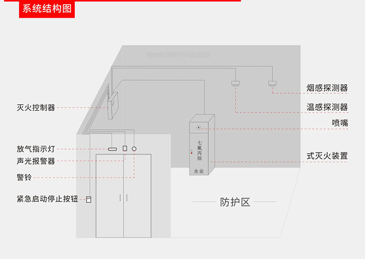 2、防護區(qū)維護結(jié)構(gòu)及門窗的耐火極限均不應(yīng)低于0.5h;吊頂?shù)哪突饦O限不應(yīng)低于0.25h。