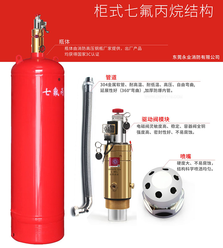 柜式七氟丙烷滅火裝置以“潔凈氣體”七氟丙烷作為滅火劑,滅火機理是通過惰化火焰中的活性自由基,實現(xiàn)斷鏈滅火。七氟丙烷的特點是:無色無味、清潔、不導(dǎo)電、毒性低、滅火效率高、不污染被保護對象,特別是對大氣臭氧層無任何破壞作用。在第一代的哈龍?zhí)娲镏?,七氟丙烷的綜合性能最好。本公司生產(chǎn)的柜式七氟丙烷滅火裝置是一種無管網(wǎng)滅火設(shè)備,具有輕便、可移動、安裝靈活的特點,外表美觀,不破壞防護區(qū)內(nèi)的整潔。滅火劑無管路損失,當火災(zāi)發(fā)生時,本裝置可直接向防護區(qū)噴射滅火劑,因此滅火效率高、速度快。本公司目前的柜式裝置將報警滅火控制器安裝在防護區(qū)外。