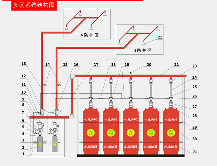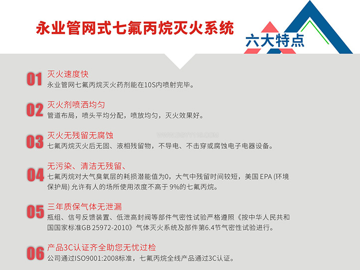 管網(wǎng)式七氟丙烷滅火裝置(4.2MPa)由瓶組架、滅火劑瓶組、容器閥、金屬軟管、單向閥(滅火劑管路)、集流管、安全泄放裝置、選擇閥、信號反饋裝置、滅火劑輸送管道、噴嘴、驅(qū)動氣體瓶組、電磁型驅(qū)動裝置、驅(qū)動氣體管路、單向閥(驅(qū)動氣體管路)等組成。根據(jù)不同應(yīng)用場所使用要求,可組成單元獨立系統(tǒng)、組合分配系統(tǒng),采用全淹沒滅火方式,實現(xiàn)對單防護區(qū)和多防護區(qū)的滅火保護,技術(shù)先進、滅火效率高、維護方便。
